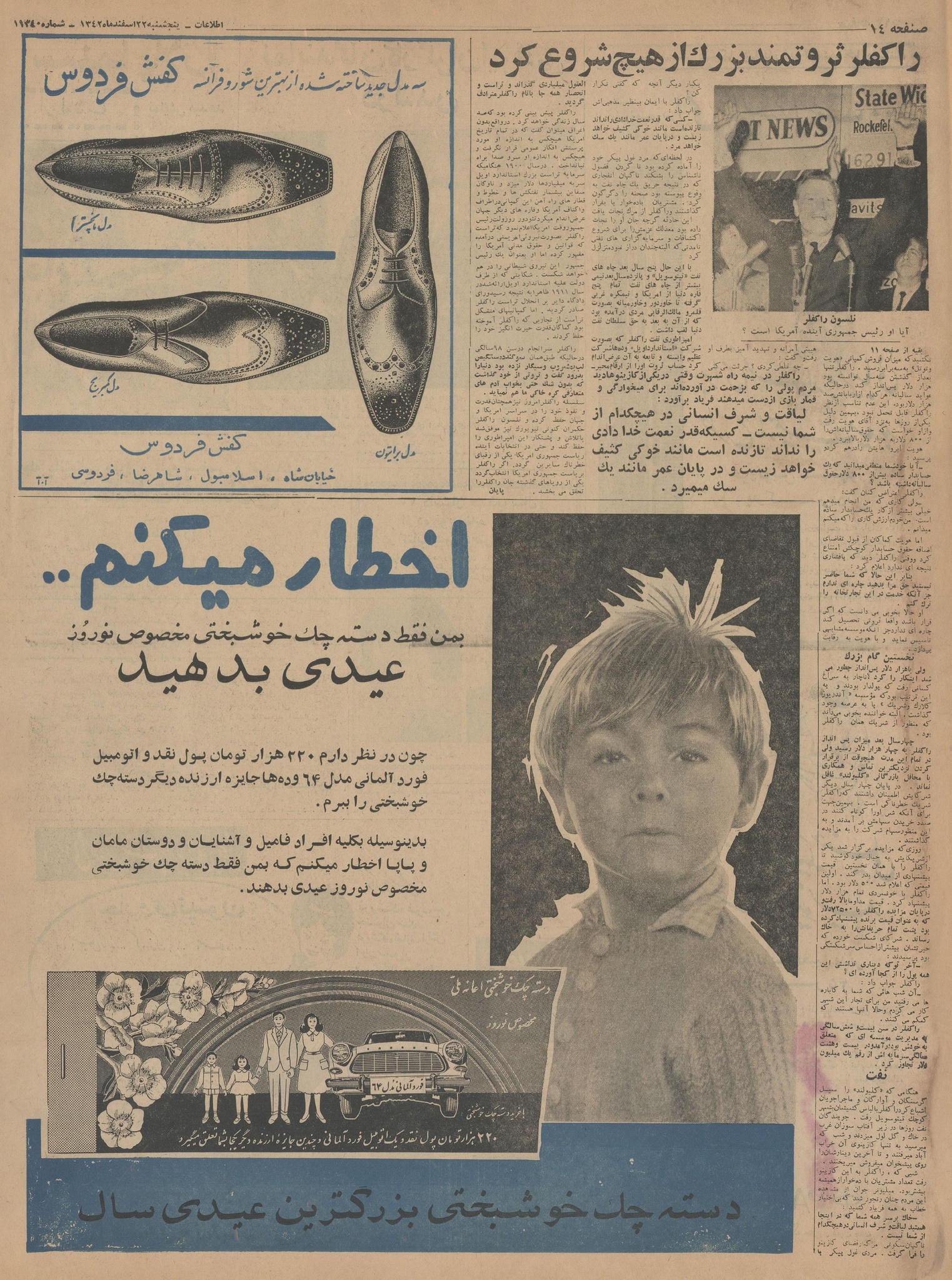 | کنونی | ۲۵ ژانویهٔ ۲۰۱۵، ساعت ۱۵:۳۱ | ۵٬۸۶۶×۷٬۸۳۹، ۲۴ صفحه (۵۲٫۶۷ مگابایت) | Bijan (گفتگو | مشارکتها) | {{PD-Iran}} رده:روزنامه اطلاعات سال ۱۳۴۲ |