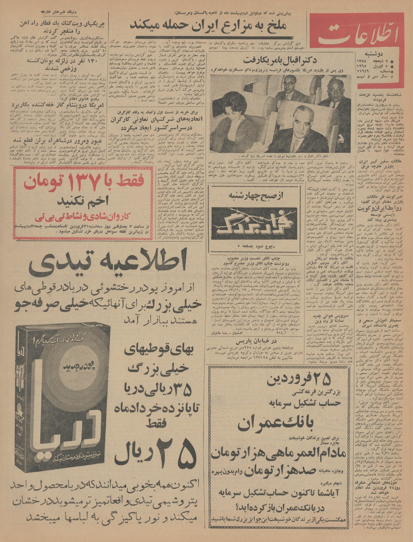 | کنونی | ۵ آوریل ۲۰۱۵، ساعت ۰۵:۴۴ | ۶٬۰۱۶×۷٬۹۲۵، ۱۶ صفحه (۲۷٫۵۱ مگابایت) | Bijan (گفتگو | مشارکتها) | {{PD-Iran}} رده:روزنامه اطلاعات سال ۱۳۴۴ |