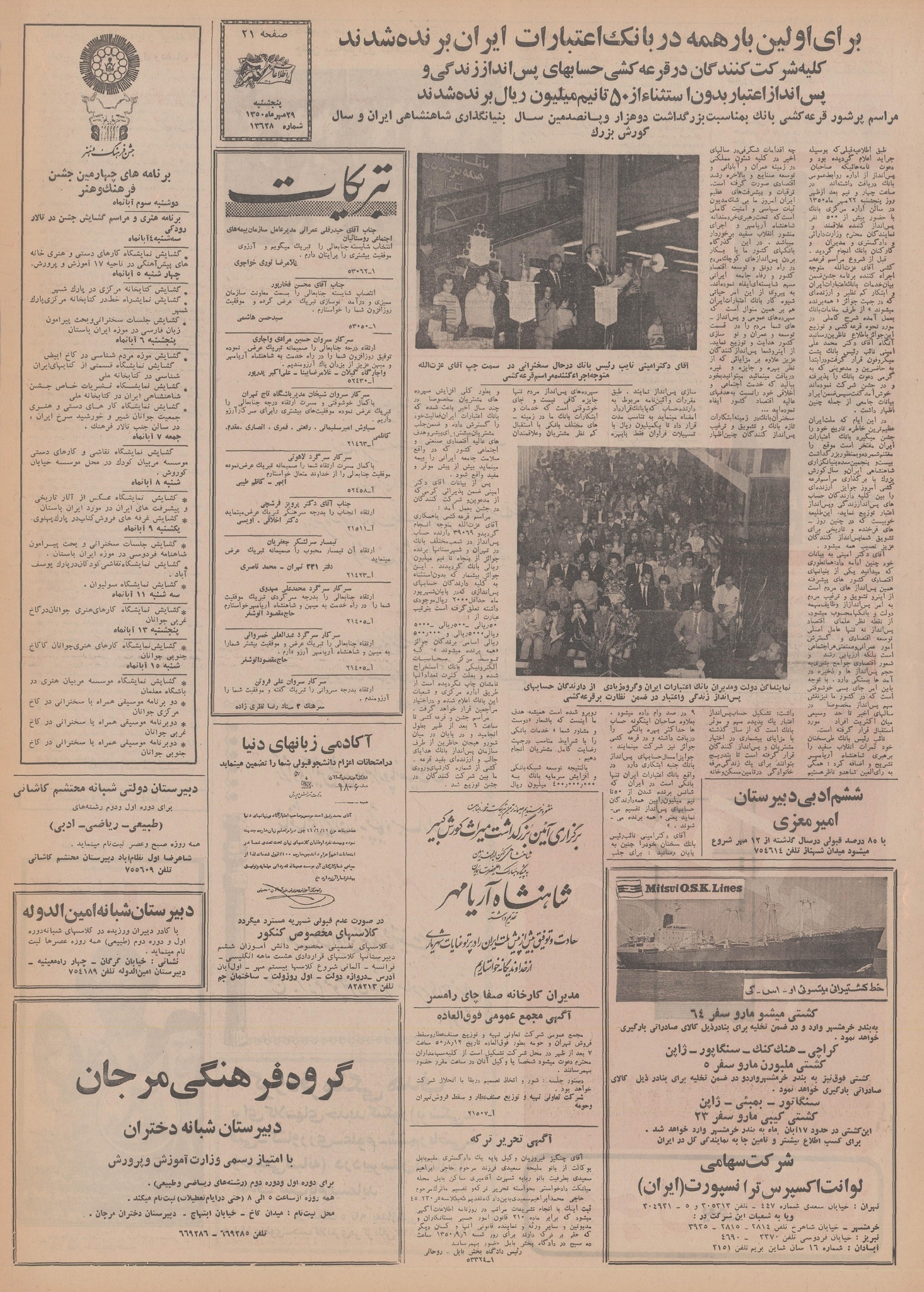 | ۵ نوامبر ۲۰۱۴، ساعت ۰۸:۰۲ | ۱٬۴۰۰×۲٬۰۰۰، ۲۱ صفحه (۱۱۸٫۲۳ مگابایت) | Rostamfarokhzad (گفتگو | مشارکتها) | {{PD-Iran}} رده:روزنامه اطلاعات سال ۱۳۵۰ |