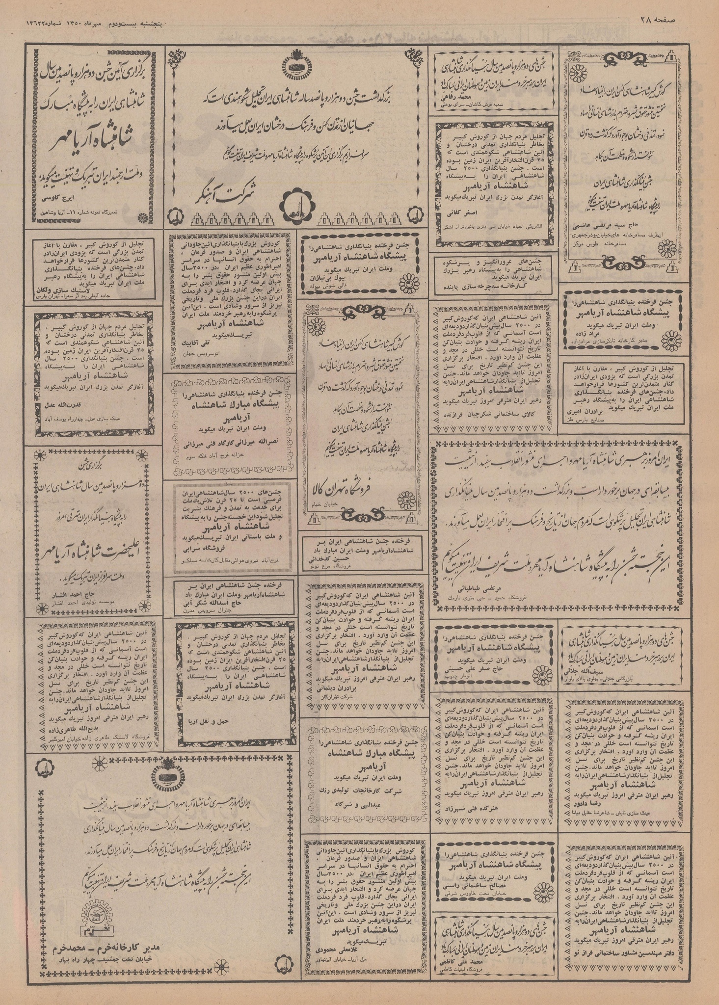 | ۲۰ اکتبر ۲۰۱۴، ساعت ۱۶:۳۹ | ۲٬۴۳۱×۳٬۵۲۷، ۴۳ صفحه (۱۱۲٫۱۲ مگابایت) | Bijan (گفتگو | مشارکتها) | {{PD-Iran}} رده:روزنامه اطلاعات سال ۱۳۵۰ |